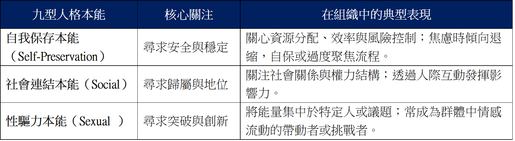 九型人格(Enneagram)指出,每個人都被三種本能驅動:自我保存(Self-Preservation)、社會連結(Social)、與性驅力(Sexual )。