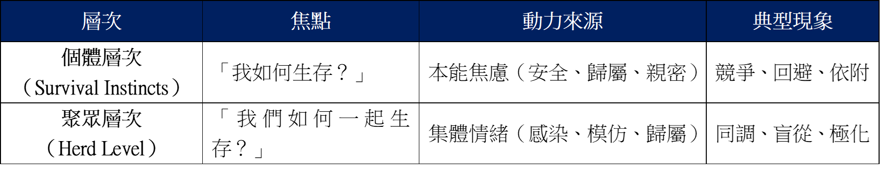 這三種本能雖然起於個人,但當許多成員在壓力或變革情境下同時被激發時,這些個體層次的焦慮會相互感染、共振放大,形成整個系統的「聚眾層次(Herd Level)」現象。